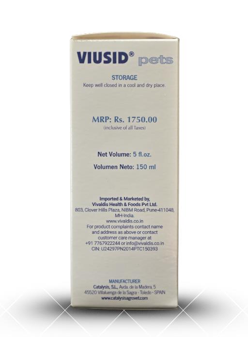 Vivaldis Viusid is a high-potency nutritional supplement for dogs and cats, primarily used as an immunomodulator and antioxidant. It is manufactured by Catalysis (Spain) and marketed in India by Viva