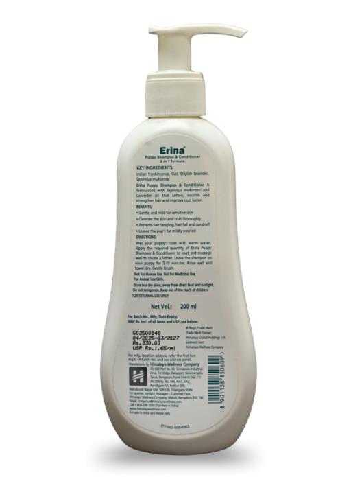 The Himalaya Erina Puppy Shampoo & Conditioner is a gentle, 2-in-1 herbal formulation specifically designed for puppies from 4 weeks up to 18 months of age. It focuses on maintaining a healthy, lustr