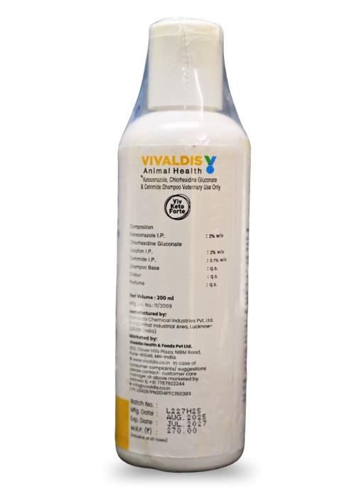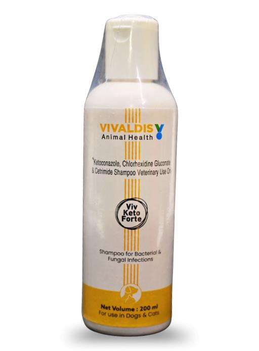 Vivaldis Viv Keto Forte Shampoo is a professional veterinary medicated shampoo used to treat fungal and secondary bacterial skin infections in dogs and cats. It combines three active ingredients to p