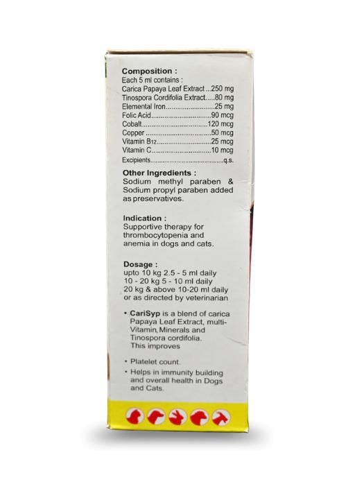Carisyp Syrup is a specialized nutritional supplement and hematinic formulated for dogs and cats to support blood health and immunity. It is primarily used as supportive therapy for conditions like t