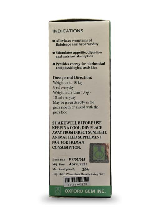 Oxford Gem Pepsozyme Pet Syrup is a veterinarian-recommended digestive enzyme supplement for dogs and cats, manufactured and marketed by Oxford Gem Inc., based in Kolkata. It is primarily used to man