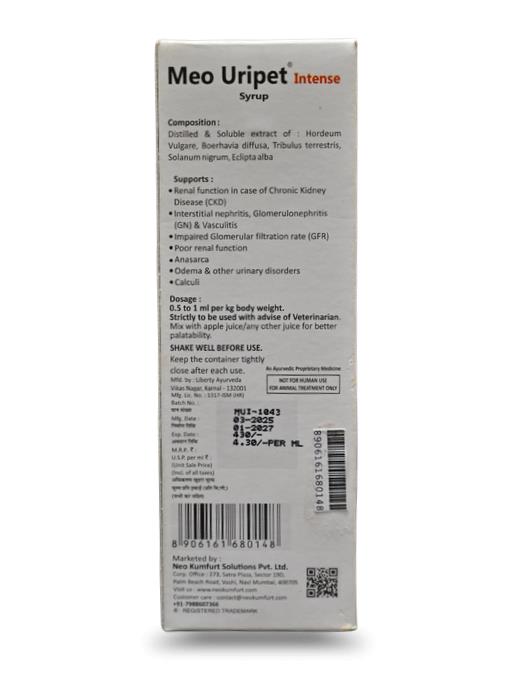 Meo Uripet Intense (by Neo Kumfurt) is a specialized herbal syrup formulated to support urinary tract and kidney health in cats. It is specifically used to manage conditions like Chronic Kidney Disea