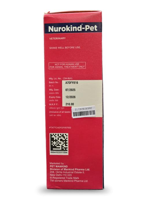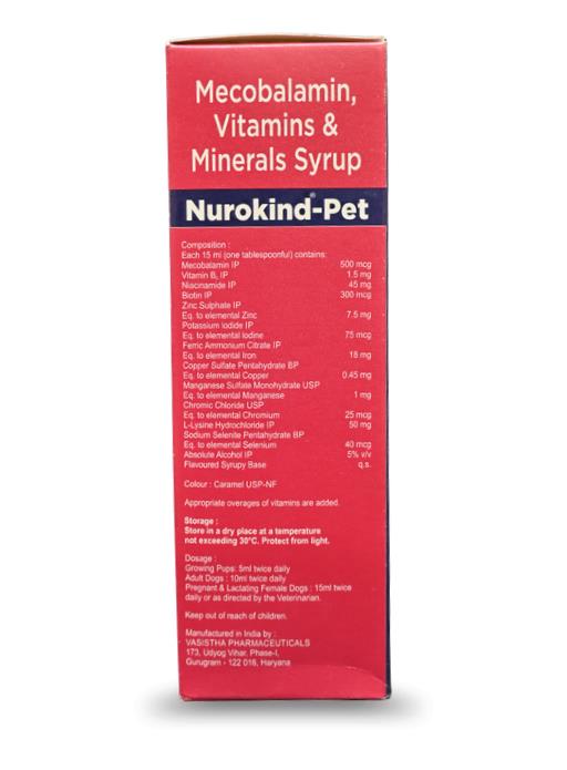 Nurokind Pet Syrup is a therapeutic multivitamin and mineral supplement from Vet Mankind (a division of Mankind Pharma). It is primarily used as a "nerve rejuvenator" to support neurological health a